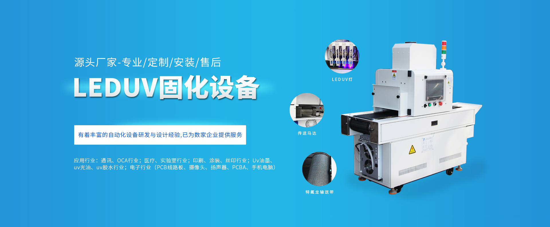 公司產品廣泛應用于:塑膠五金涂裝、家具木器石材涂裝、印刷、噴繪上光、絲印移印、PCB、涂布等行業(yè),廣泛適用于各種:UV光油、UV油墨、UV油漆、UV膠水等多種類UV固化